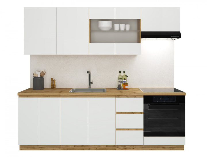 Корпуси кухні виготовлені з ЛДСП, в приємному , деревоподібному декорі “дуб вотан”, високої якості. Якісні кріплення, телескопічні напрямні, роблять кухню Софт зручною та надійною. Білі фасади , можуть похвалитися трендовим рішенням оформлення і функції відкривання. Фігурне заглиблення виконує функцію ручки.