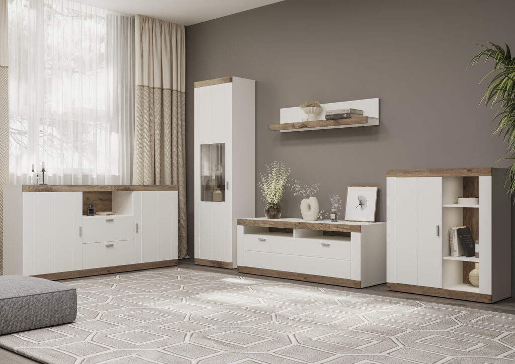 Комод виготовлений у поєднанні кольорів “дуб вотан” і “білий”, що надає йому сучасного й елегантного вигляду, який легко вписується в інтер’єри в стилях мінімалізм або модерн. Світлі фасади і тепла текстура дерева створюють гармонійне поєднання, перетворюючи комод на стильний і функціональний елемент вашого інтер’єру. За необхідності комод може бути доповнений підсвіткою, яка додасть особливої атмосфери у вечірній час.